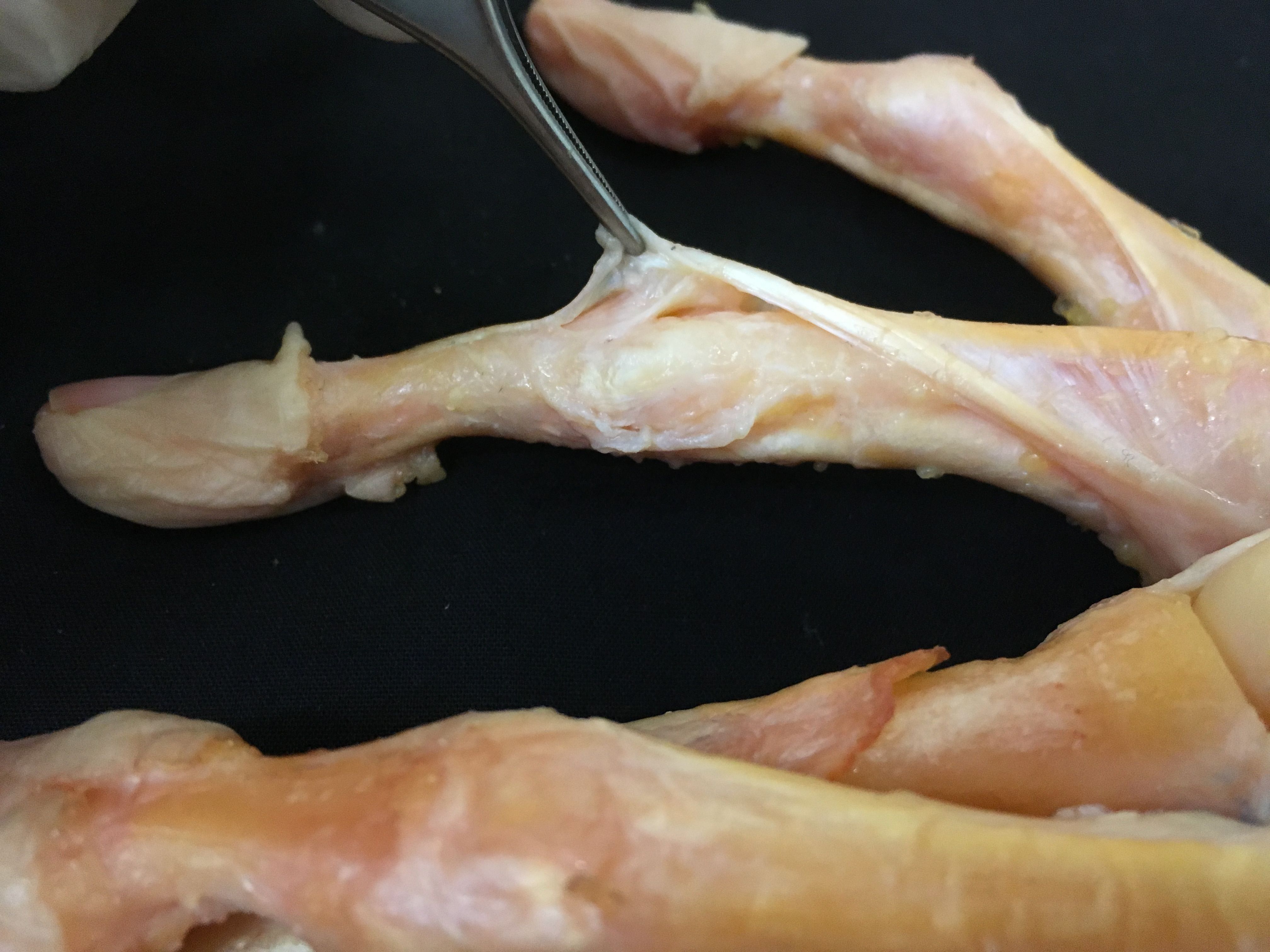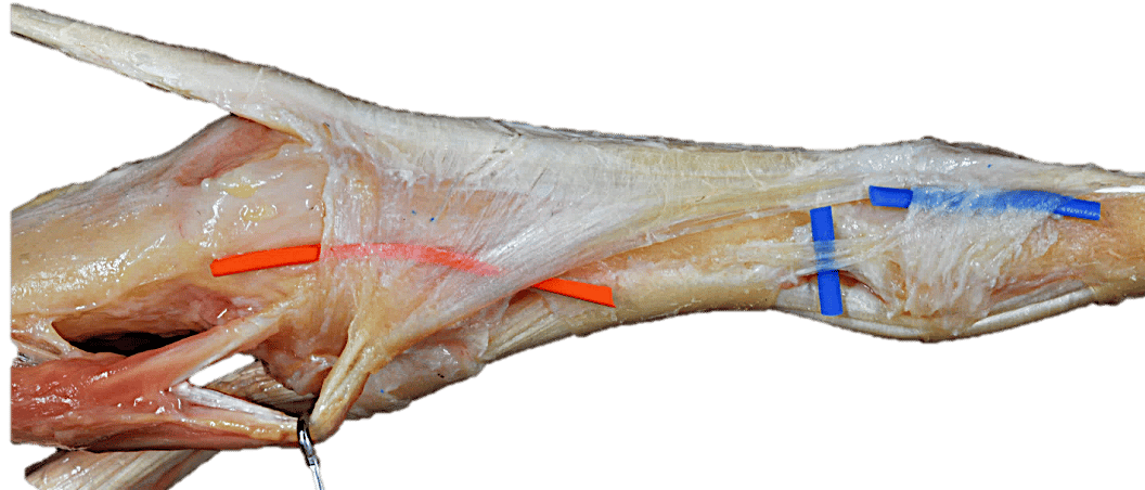 En esta disección vemos bien la banda lateral del aparto extensor (color blanco), la bandeleta central dorsal (color amarillento) y la inserción de ésta última sobre el dorso de la falange media (F2) que la pinza sujeta. La estructura que se inserta en la base de la F2 y que la pinza no sujeta es la cápsula dorsal de la articulación.